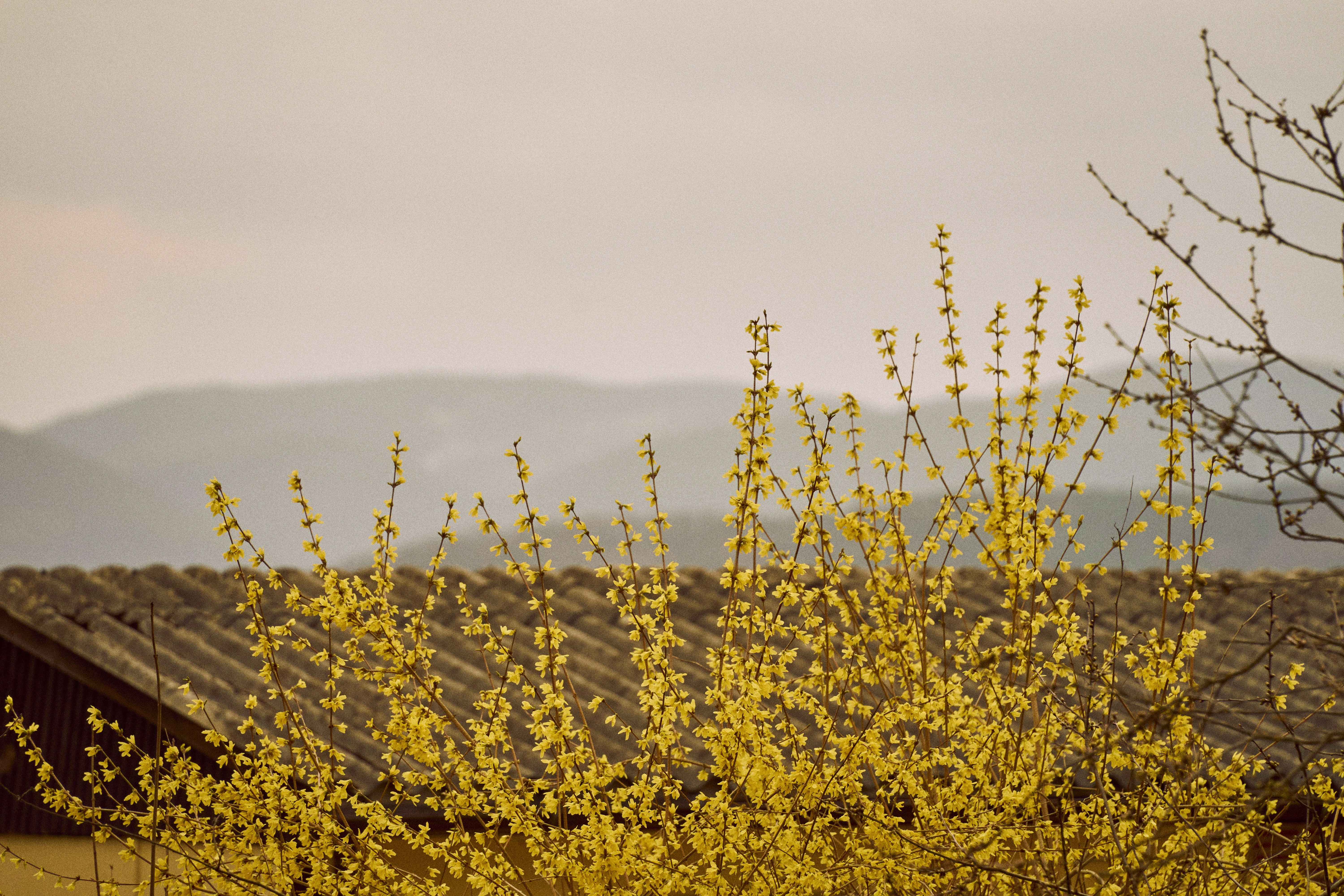 From where I sit by the window I can look right through the huge bare hydrangea and the trees whose needles make their way into and all over my house, and see in the distance that the forsythia is tinged with yellow, every day more and more. The forsythia is always the earliest bloomer. It appears before the grass is green, before the half of my yard which is a meadow turns into itself, before anything else even has buds. The huge locust, which is my favorite tree, is covered with lichen, something else I love, and whenever I see a fallen twig covered in flakes of gray and green I pick it up and stick it in whichever small vessel is still empty. When the locust gets its leaves, they are an excited light green, almost like neon, you can imagine a little kid hopping up and down, proud of being so bright and alive, but it sobers up as spring continues.